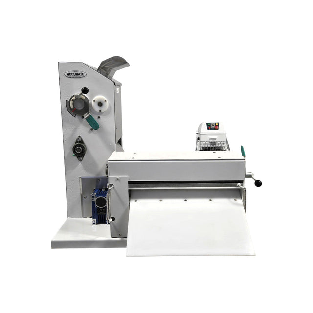 Dough Sheeter. Features 3HP, Designed for pizza; roti; pita bread; pie crust; coffee cake and many other doughs, Rolls dough up to 18in diameter, Capacity: approximately 450 pieces per hour with one operator, Easy to adjust rollers allow operator to adjust dough thickness in seconds, Heavy guage steel construction - easy to clean, Short rollers: 3 1/2in diameter x 10in length; Long rollers: 3 1/2in diameter x 18in length, Spring loaded sanitary plastic scrapers - removable for cleaning, Easy accessible on/off switch, 1 PH / 60 Hz / 120 V / 12 amps, 32W X 33D X 31H, 300Lbs, Please Note: Only photographed accessories are included