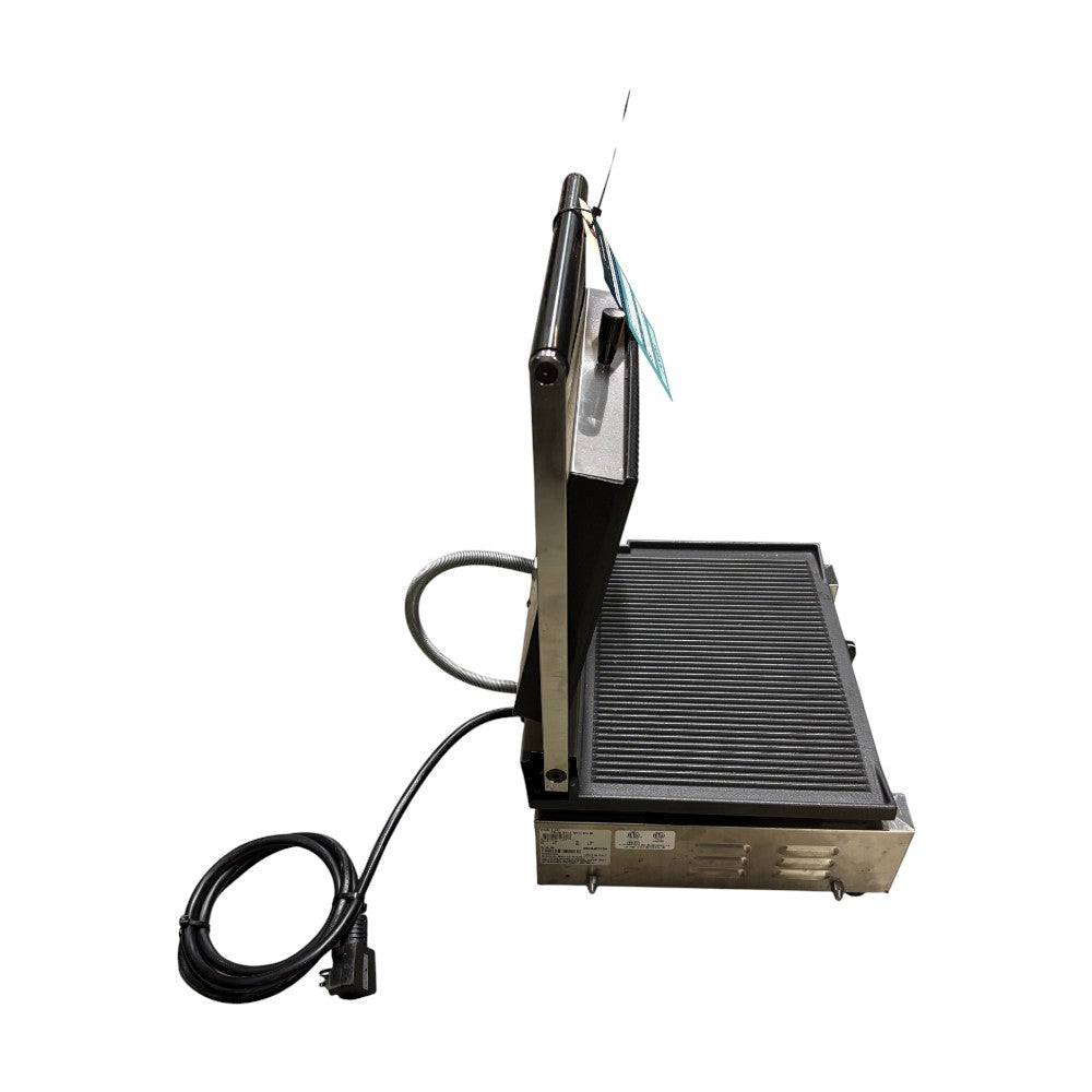 Panini Grill - Ribbed - 10 x 14. Features Stainless Steel Construction, Grooved Top and Bottom Grill, Grill Surface 10 x 14, Temp Control: 50 - 300C, Non Slip Rubber Feet, Functioning Pilot Lamp, 14.4 Inches height when open, Amps 15, 1.7kW, 120Vz/60Hz, 14.4W X 15D X 19.75H, 53Lbs, Please Note: Only photographed accessories are included