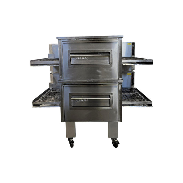 Double Stacked Conveyor Pizza Oven - Nat Gas. Features Must be installed by a Certified Gas Technician, Double Stacked, Belt Dimensions: 32 x 72 Inch, Variable digital speed control on conveyor belt, Each Cooking Chamber: 32 x 36 inch, Removable front Panel, Efficient power Gas Burner, High Velocity Precision targeted air flow, Locking Casters, Each BTU/Hour 120000, 72W X 50D X 68H, 950Lbs, Please Note: Only photographed accessories are included