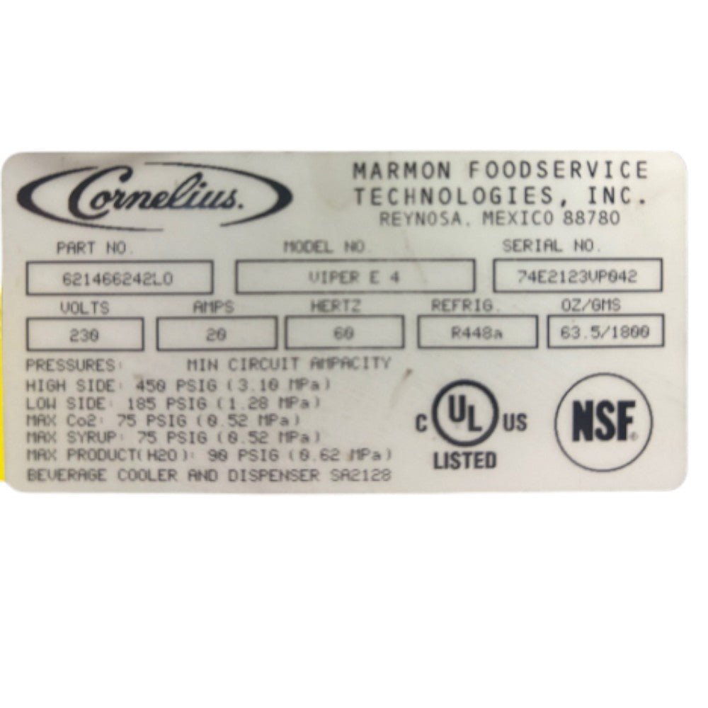 Commercial Frozen Beverage Dispenser. Features Includes Cart, Stainless Steel Sides, 4 flavor compartments, 4 SPH valves keep flavors separate, Serves Carbonated Beverages, Refrigeration is self-contained, Air Cooled and 20 Amps, Programmable sleep mode, Intelligent Defrost and R448A Refrigerations, 79W X 32.5D X 75.7H, 700Lbs