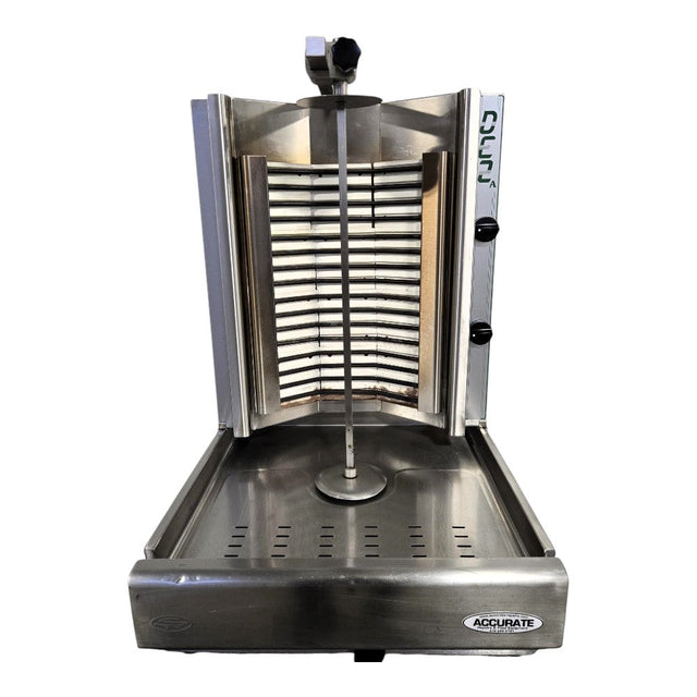 Electric Gyro Machine. Features Stainless steel construction, Line turbos have double row of burners for very fast roasting, Front control panel, Burners protection net are easy to remove and clean, 3 burners, Grease drawer prevents spill and easy to remove and clean, Electric socket for electric knife use, 65 lb meat apacity, 18A/ 6600W, 21W X 25D X 33H, 82Lbs, Please Note: Only photographed accessories are included
