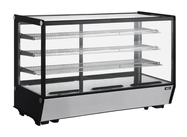 This 48-inch square glass refrigerated display provides 227 liters of storage, ideal for showcasing cakes, pastries, and chilled foods. Built with LED lighting, adjustable shelves, and rear sliding doors, it delivers excellent visibility and reliable cooling for foodservice operations.