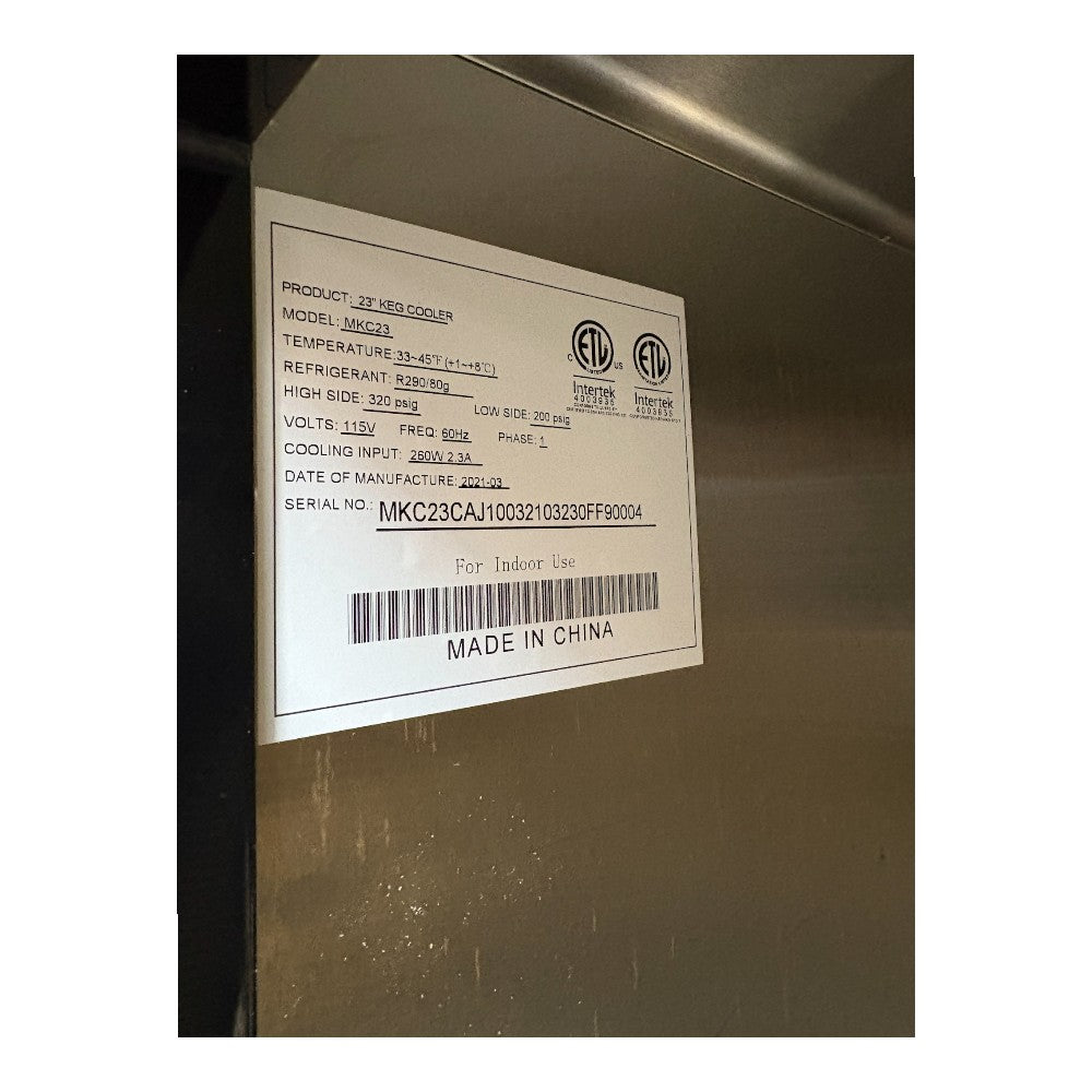 Keg Cooler - 23 inch. Features Stainless steel construction, Temp Range: 33-45 F (1-8 C), Dixel digital controller, 7.1 CuFt capacity, R290 Refrigerant, High-side: 320 psig Low-side: 200 psig, 260 W/ 2.3 A, 115 V/ 60 Hz/ 1 Ph, 23W X 31.1D X 39.25H, 132Lbs, Please Note: Only photographed accessories are included