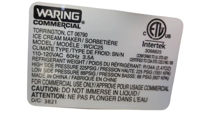 Ice Cream Machine. Features Stainless steel exterior with compact design for countertop, 2.5 quarts capacity producing ice cream or frozen yoghurt or gelato in as little as 30 minutes, Removable aluminium batch bowl for easy cleaning and storage, LCD Display, Automatic programs for hands free operation, Heavy-duty stainless steel paddle, Built-in compressor so NO pre freezing required, The Keep Cool feature maintains ice cream at the ideal temperature after process completion, Refrigerant 134a, 110-120V/60Hz, 3.5A, 420W, 15W X 17.375D X 20.5H, 43Lbs