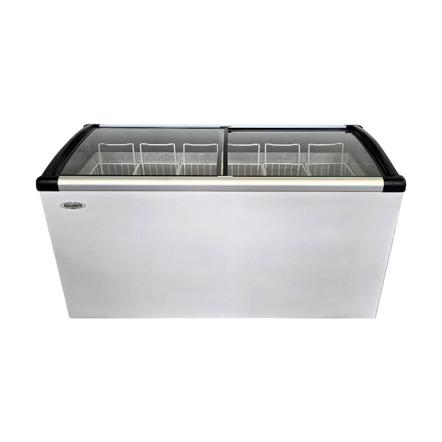 Ice Cream Merchandiser. Features Pre-coated steel plate inner tank, Tempered & Low-e sliding glass doors, 9.3 CuFt capacity, D-type evaporating pipe, Aluminum alloy+ PVC cabinet frame, 4 Universal casters, Interior LED lighting, R290 Refrigerant, 110-120 V/ 60 Hz/ 1 Ph, 56.5W X 24D X 33H, 324Lbs, Please Note: Only photographed accessories are included
