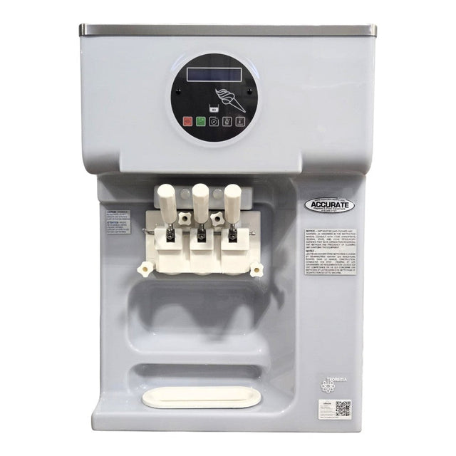 Soft Serve Ice Cream Machine. Features Gravity-fed, 2 19-quart hoppers, Air-cooled, Production capacity: 265 4-oz servings per hour, Self-pasturizing, High-side: 420 psig Low-side: 206 psig, R-404A Refrigerant, 21.5W X 34.4D X 35.3H, 418Lbs, Please Note: Only photographed accessories are included