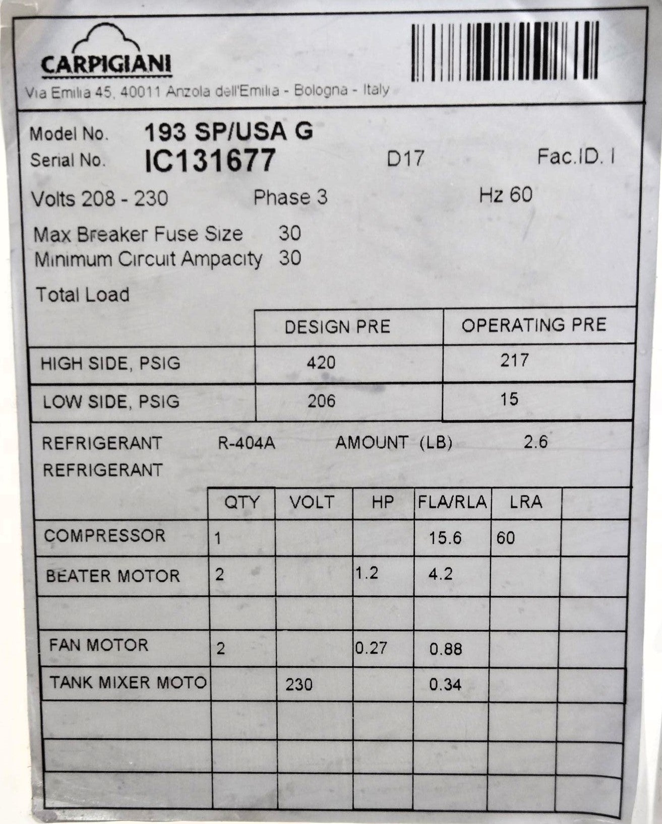 Carpigiani 193 SP/USA G Soft Serve Ice Cream Machine