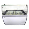Ice Cream Freezer with Guard - 49-in Flat top. Features White powder-coated steel exterior and precoated steel interior walls, Displays 8 and stores 6 of 3-gallon tubs of ice cream, Comes with 4 casters (2 with brakes) for easy mobility, Equipped with sliding doors and locks, Sneeze guard to prevent contamination, Temperature Range: -26° to 6° C (-15° to 43° F), R290 Refrigerant, 4A, 49.6W X 28D X 52H, 242.5Lbs, Please Note: Only photographed accessories are included