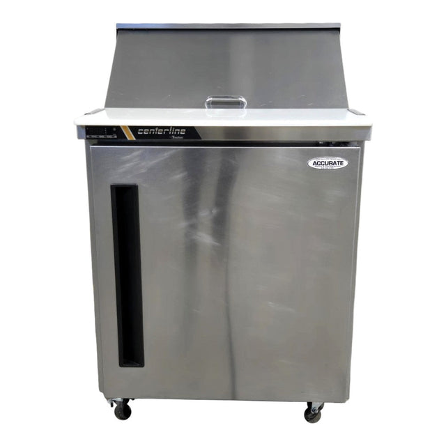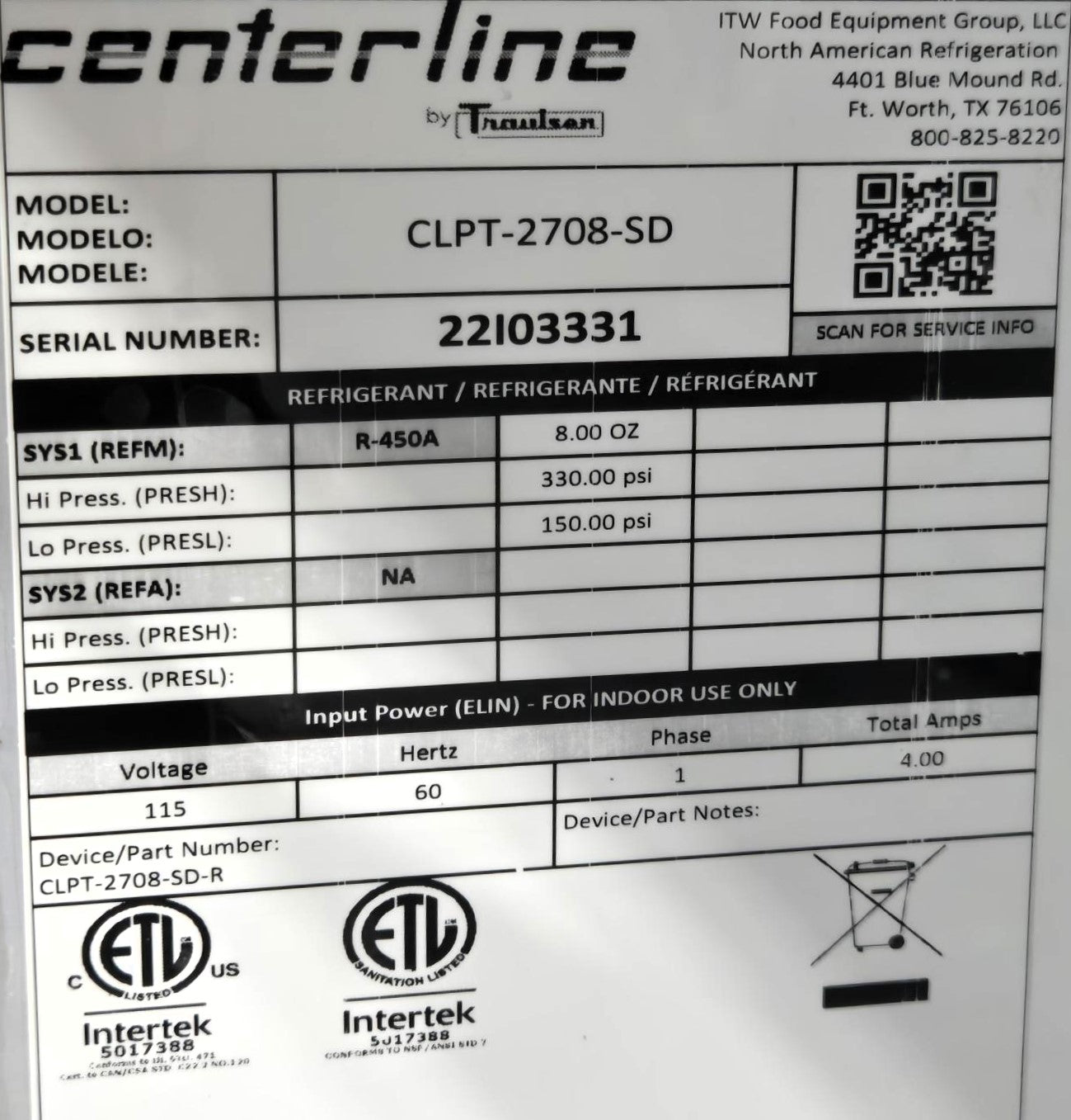 Refrigerated Prep Table. Features Stainless Steel Construction, Temp Range Approx 32-41F, LED digital temp controls, Work surface height 34.81, Cutting board 12 inches, Refrigerant R-450A, PSI Hi 330 Low 150, 8Oz, 4 Amps, 27.9W X 32.75D X 44H, 229Lbs, Please Note: Only photographed accessories are included