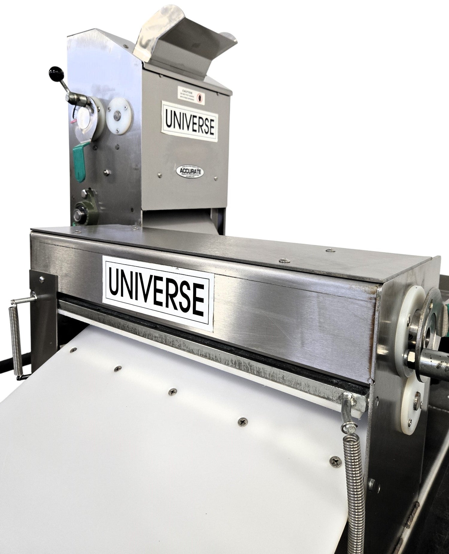 Dough Sheeter. Features Hard chromed precision ground, Short rollers: 3.5 in diameter x 10 in length, Long rollers: 3.5 in diameter x 18 in length, Spring loaded removable scrapers, Plastic discharge chute, Easily accessible on/off switch, Stainless steel chute and receiving tray, 3/4 HP, 120 V/ 60 Hz/ 1 Ph, 32W X 33D X 31H, 300Lbs, Please Note: Only photographed accessories are included
