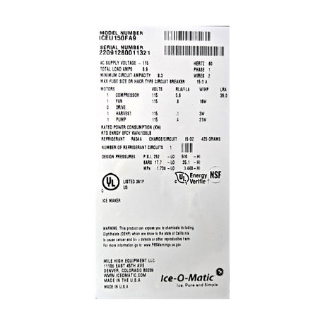 Ice-O-Matic ICEU150FA9 Undercounter Ice Machine