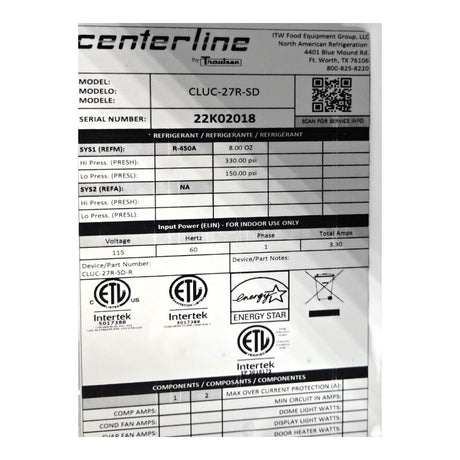 - Online OnlyUsed ItemCENTERLINE Centerline CLUC-27RSD Undercounter Refrigerator 89.358 kg $1,150.00 CADUnit price /Unavailable