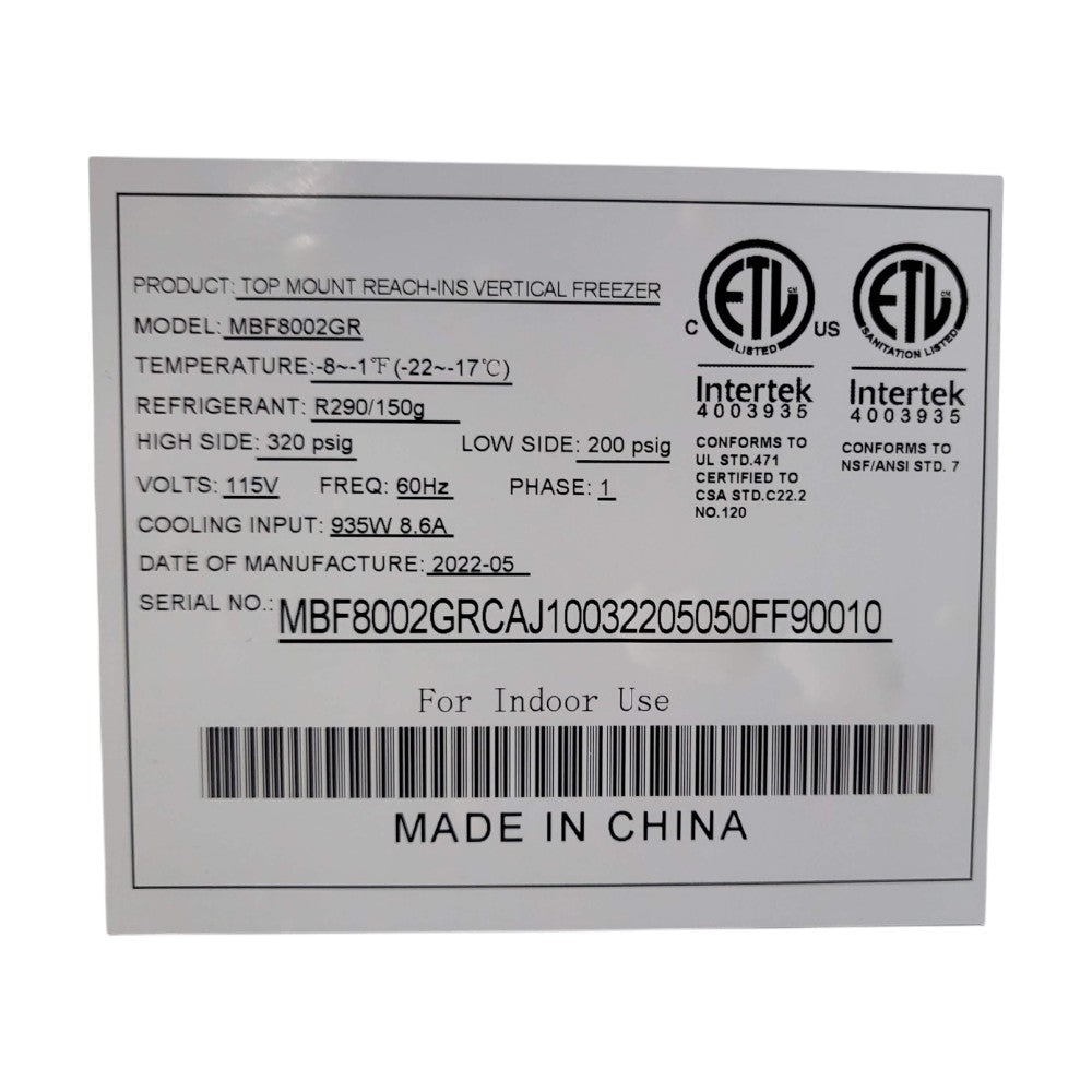 Freezer. Features Stainless Steel Construction, Two door, -8F--1F-22C--17C temperature range, R290 refrigerant, 935Watts, 8.6amps, 115V/60hz/1ph, 51.7inchW, 33.3inchD, 83.9inchH, 430lbs