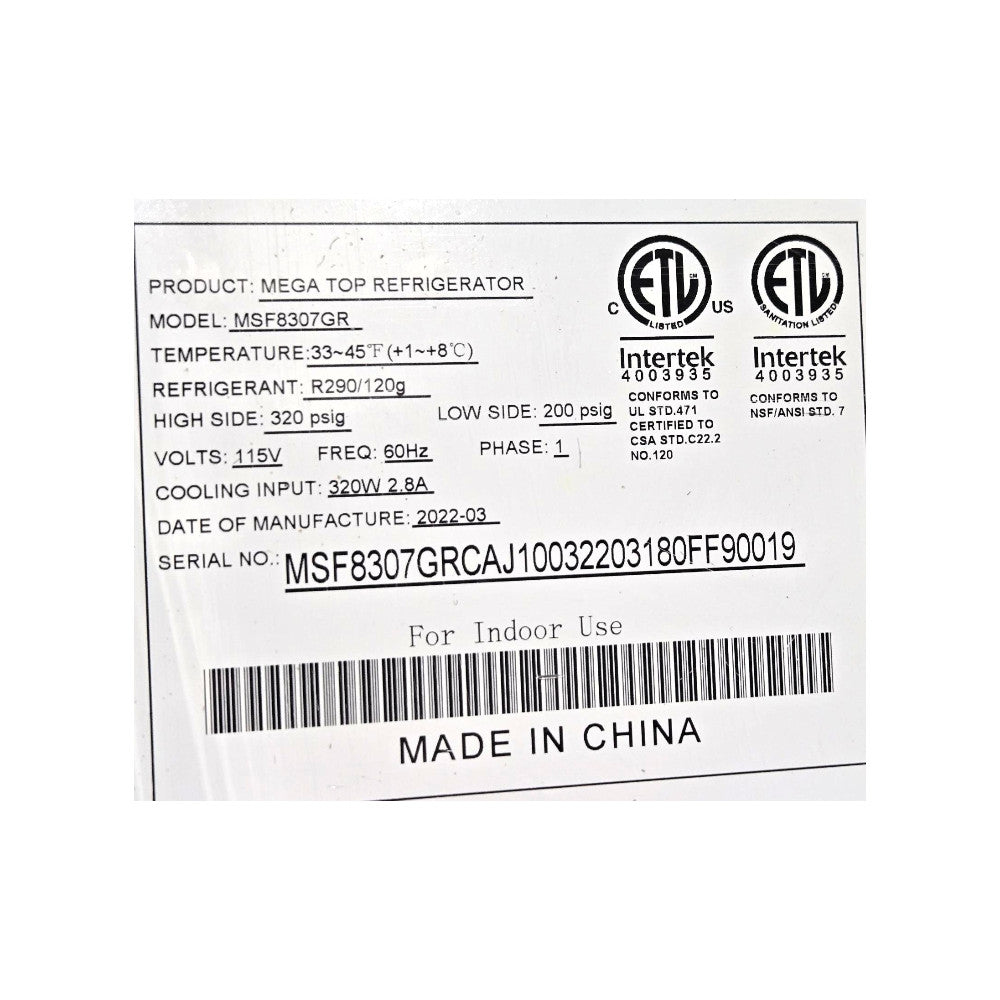 Mega Top Refrigerator. Features Stainless steel construction inside and out, 33-45 F (1-8 C), Features a full-length cutting board/ refrigerated base/ enclosed food pan area on top, Interior capacity of 18.6 cubic feet, Self-closing & stay open doors, R290 Refrigerant, High-side: 320 psig Low-side: 200 psig, 320 W/ 2.8A, 115 V/ 60 Hz/ 1 Ph, 60.24W X 33.98D X 47.14H, 284Lbs, Please Note: Only photographed accessories are included