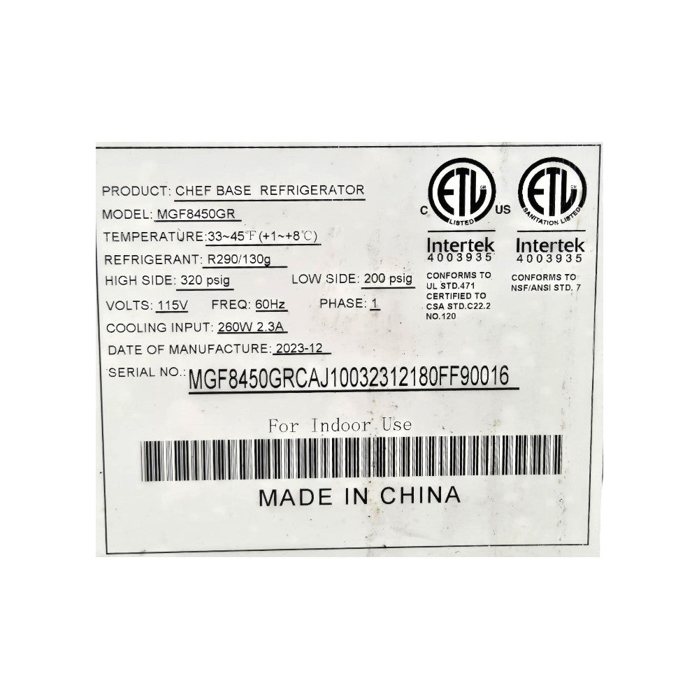 Refrigerated Chef Base. Features Stainless steel exterior and interior, Electronic temperature controller, Maintains temperatures between 34°F – 40°F, Heavy duty compressor with environmentally friendly R290 refrigerant, Magnetic drawer gaskets, One-piece heavy duty reinforced stainless steel top to support counter top equipment, R290 Refrigerant, High-side: 320 psig Low-side: 200 psig, 260 W/ 2.3A, 115 V/ 60 Hz/ 1 Ph, 48.4W X 33D X 26.6H, 220Lbs, Please Note: Only photographed accessories are included