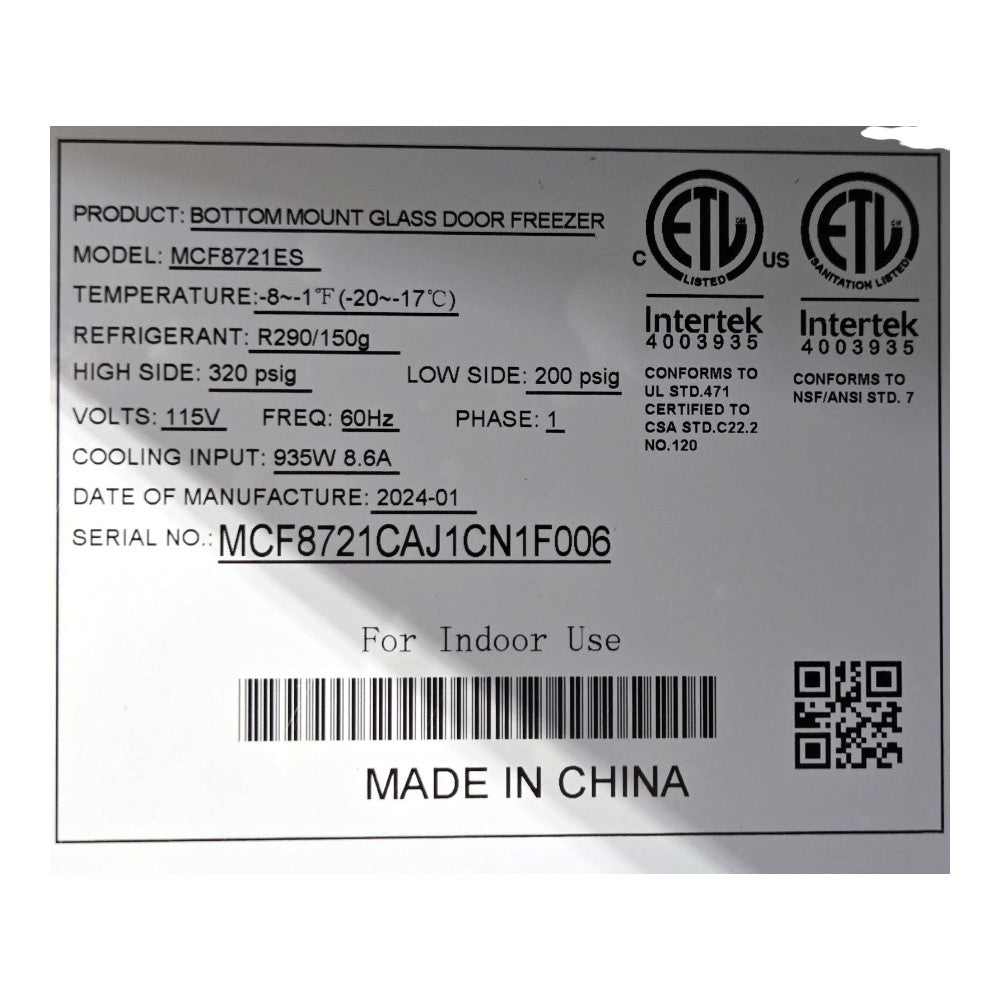 Upright Freezer - 2 Door - Broken window on left bottom inside trim. Features Black steel exterior and Stainless Steel interior, 43.8 Cu Ft Capacity, Bottom Mounted - Self Contained, LED interior lighting, Adjustable wire shelving, Temp Range: -8 to -1F, Refrigerant R290, PSIG: High 320 Low 200, Cooling Input: 935W 8.6A, 115Vz/60Hz/1Ph, 54.4W X 31.5D X 81.2H, 498Lbs, Please Note: Only photographed accessories are included
