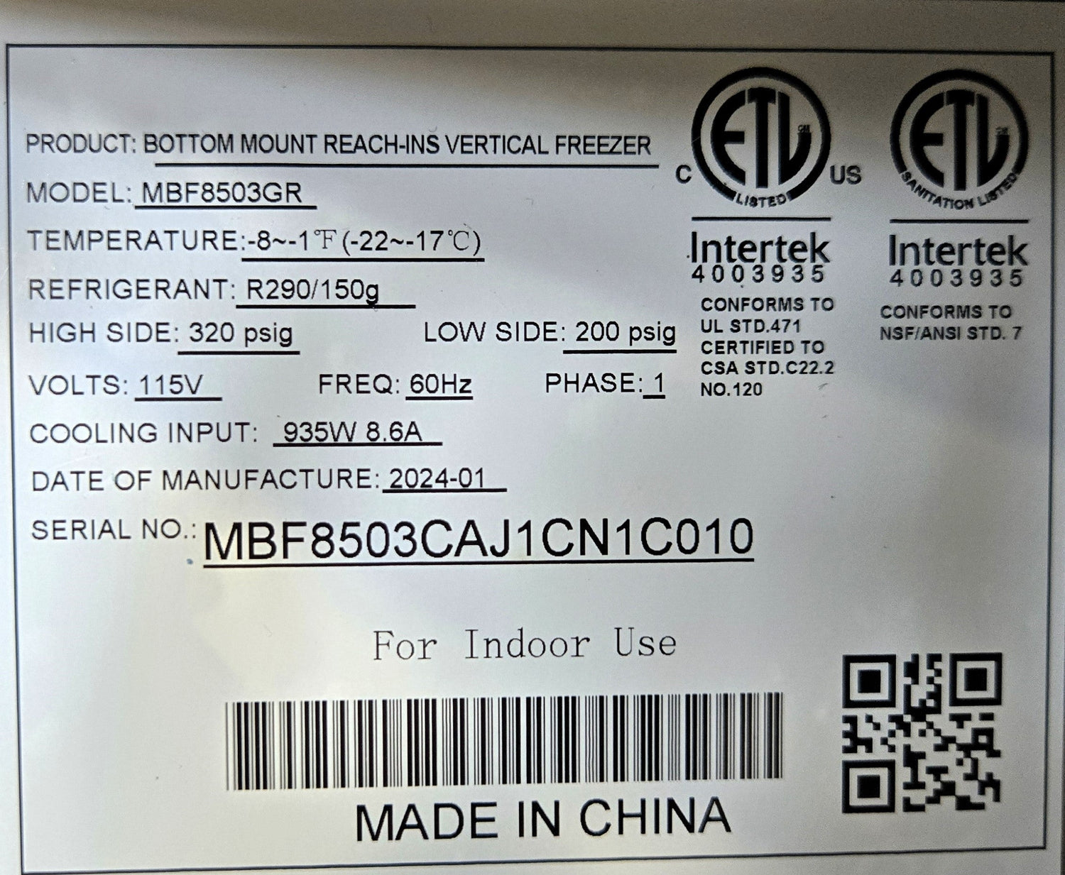 Upright Freezer - 2 Door. Features Stainless Steel Construction, Bottom Mount, 43.80 Cu Ft Capacity, LED Lighting, Temp Range: -8 to 1F, R290 Refrigerant, PSIG: High 320 Low 200, 8.6 A, 935 W, 115 V/ 60 Hz/ 1 Ph, 54.4W X 31.7D X 83.1H, 410 lbs, Please Note: Only photographed accessories are included