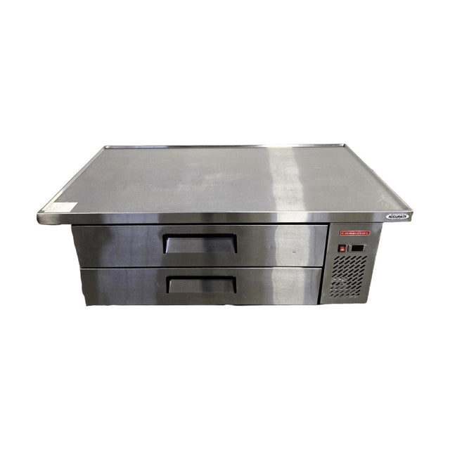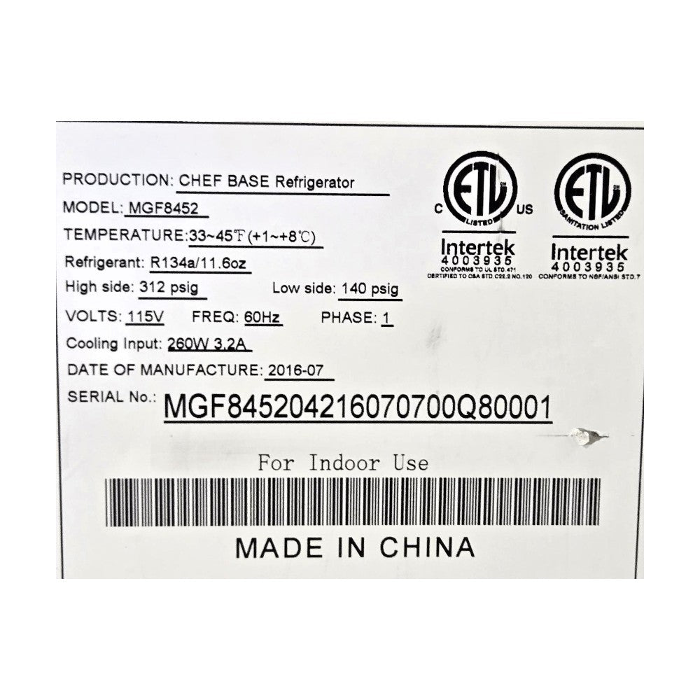 Refrigerated Chef Base. Features Interior capacity of 8.4 cubic feet, Two gravity-fed self-closing drawers, Energy efficient refrigeration system, Temp Range 33 to 45F, Refrigerant R134a/11.06oz, PSIG: High side 312 Low side 140, Cooling Input 260W 3.2A, 60.5W X 33D X 26.6H, 234Lbs